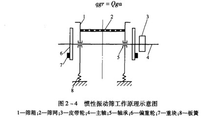 圖2-3和圖2-4分別是sZ型慣性振動(dòng)篩的外形圖和工作原理示意圖。從圖中可以看出,這種篩子有8個(gè)主要組成部分,其中篩網(wǎng)固定在篩箱上,篩箱安裝在兩個(gè)橢圓形板簧上,板繭底座固定在基礎(chǔ)上,偏重輪和皮帶輪安裝在主軸上,重塊安裝在偏重輪上。改變重塊在偏重輪上的位置,可以得到不同的離心慣性力,以此來(lái)調(diào)節(jié)篩子的振幅。主軸通過(guò)兩個(gè)滾動(dòng)軸承固定在篩箱上。篩箱一般呈15°―25°傾斜安裝,以促進(jìn)物料在篩面上向徘料端運(yùn)動(dòng)。